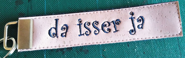 Schlüsselanhänger mit Beschriftung :"da isser ja", gestickt, Rückseite aus pflanzlichem Filz (aus Maisabfällen), verschiedene Farben